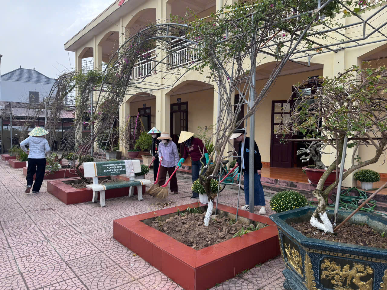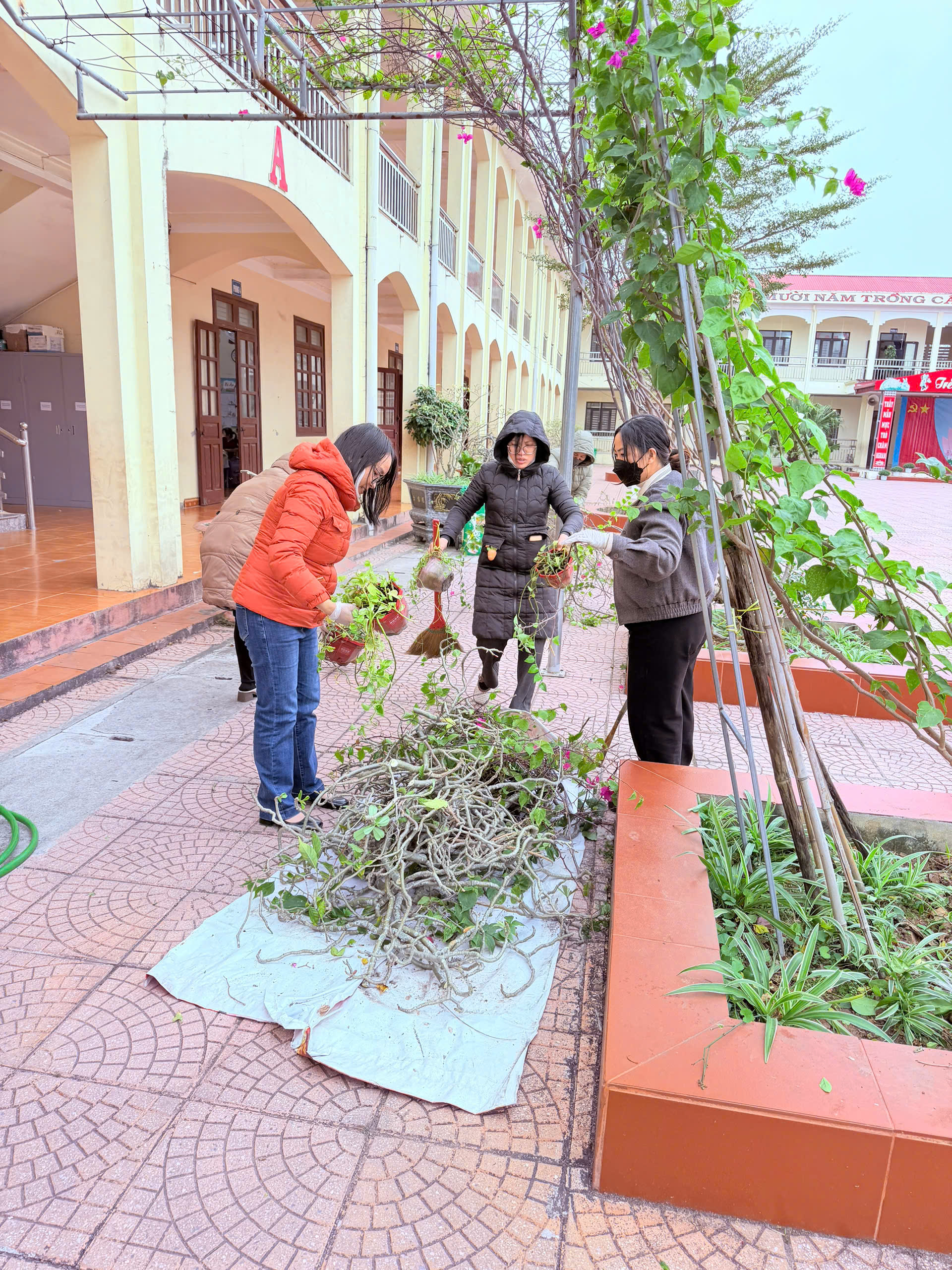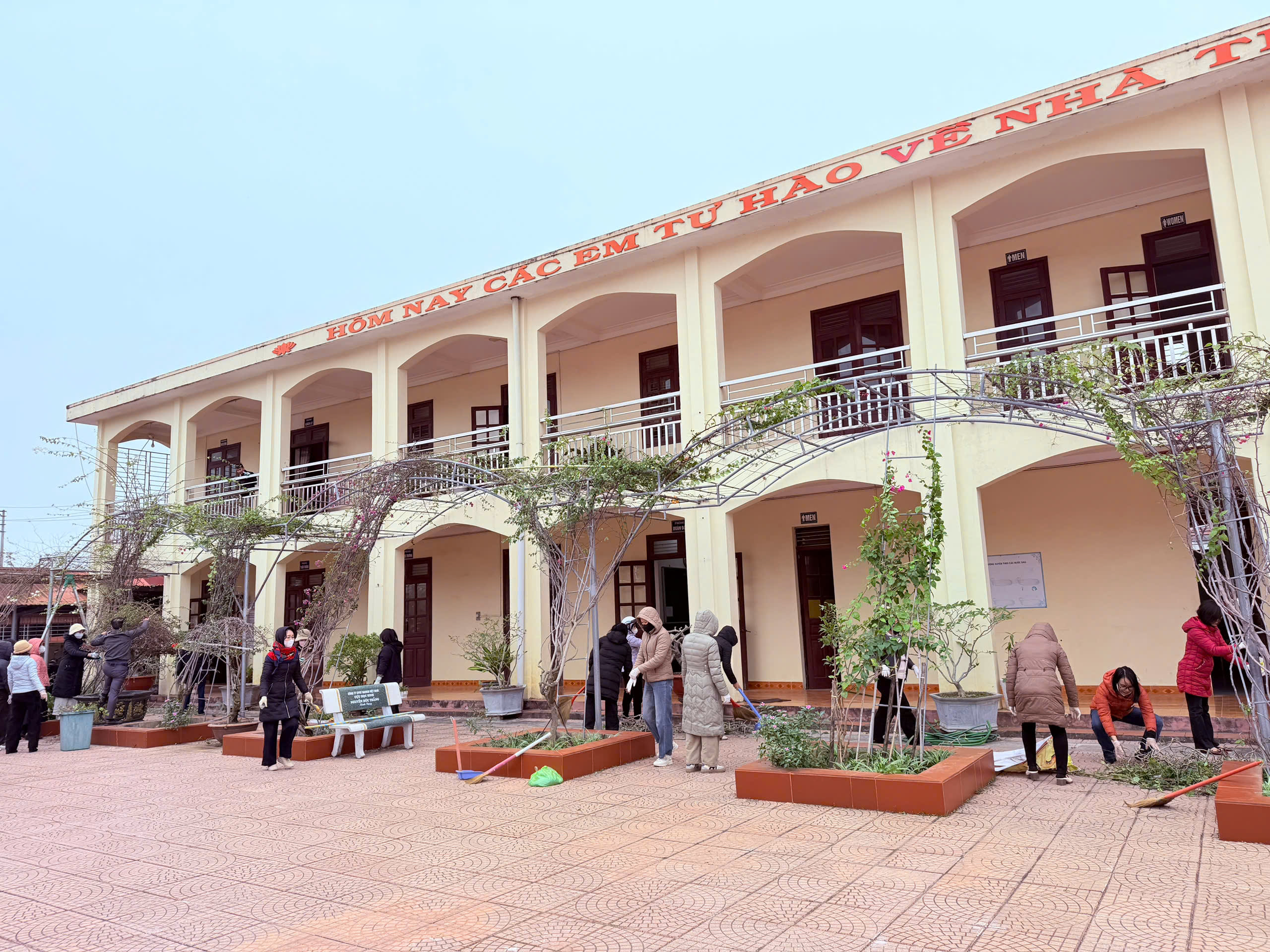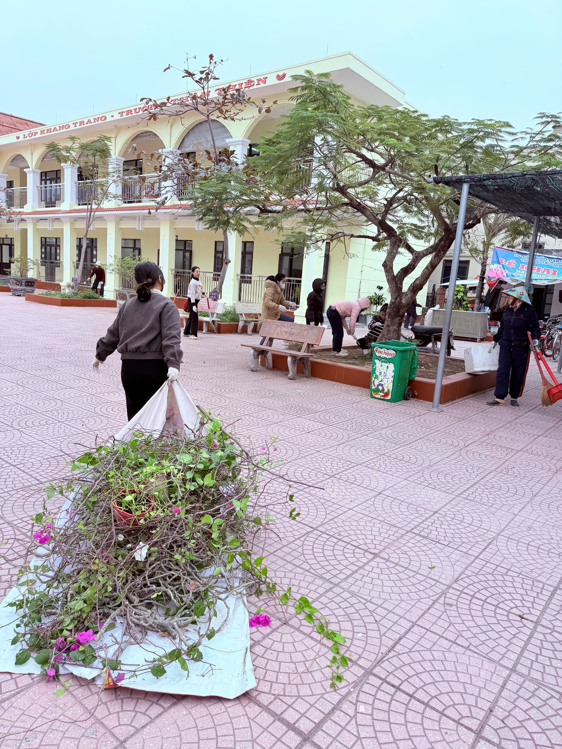 - Tổng vệ sinh khuôn viên: Làm sạch hệ thống sân chơi, bồn hoa và các khu vực chức năng trong toàn trường.